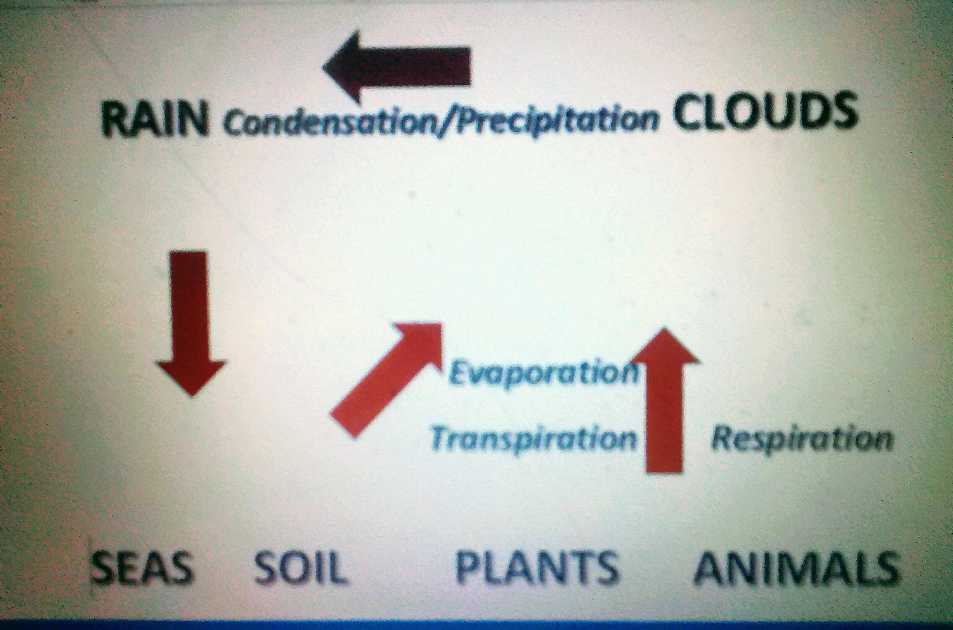 Rainfall sends water to the soil, rivers/streams much of which ends in seas and oceans. Evaporation takes much of the water as vapour from the earth to higher altitudes of the atmosphere where it condenses to water and precipitate as rain. That's what everybody knows, backed by science.