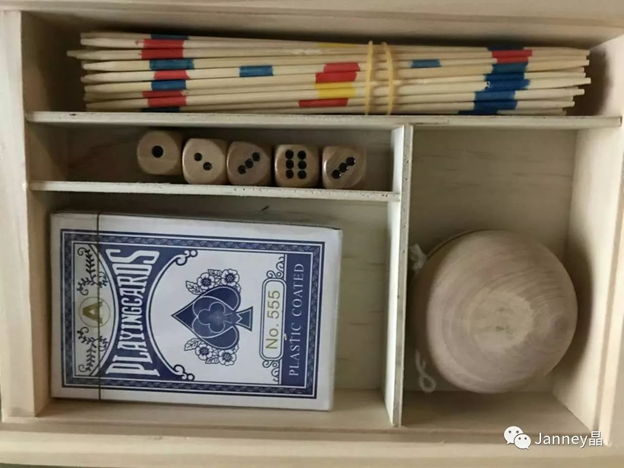 里面有扑克牌一副, 骰子5个,悠悠球一个,还有一组小棒。