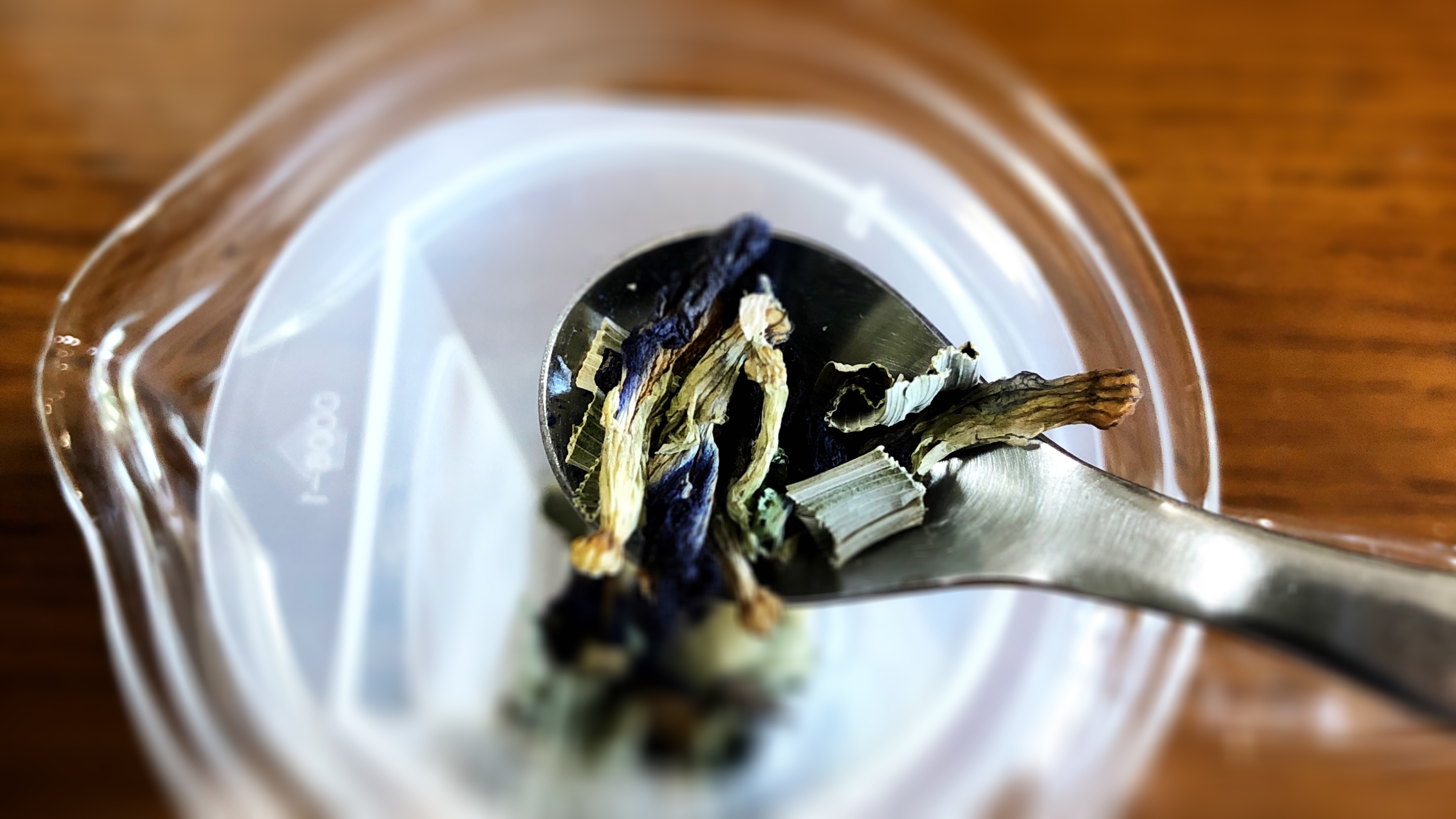ティースプーンで茶葉を取ってみると、確かに青い花が見えます。