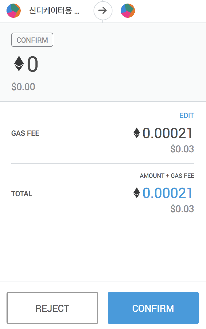 아래와 같이 송금에 대한 마지막 Confirm 화면이 나옵니다. "Confirm" 버튼을 누르면 송금 완료! 이제 메타마스크 홈화면으로 돌아가세요.