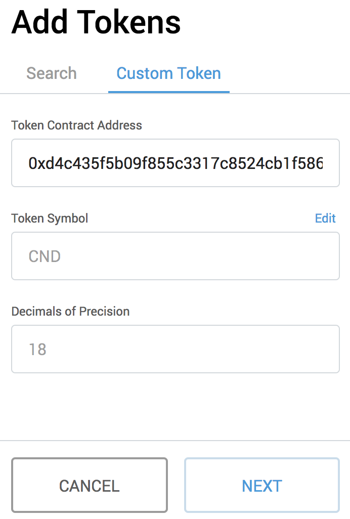 아래 그림과 같이 "Custom Token" 탭을 선택하고 "Token Contract Address"에 "0xd4c435f5b09f855c3317c8524cb1f586e42795fa" 값을 넣습니다. 그러면 아래에 있는 "Token Symbol"과 "Decimals of Precision" 값은 자동으로 채워집니다. "NEXT" 버튼을 클릭합니다.