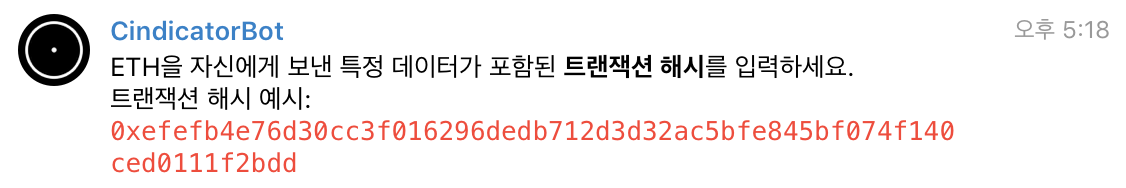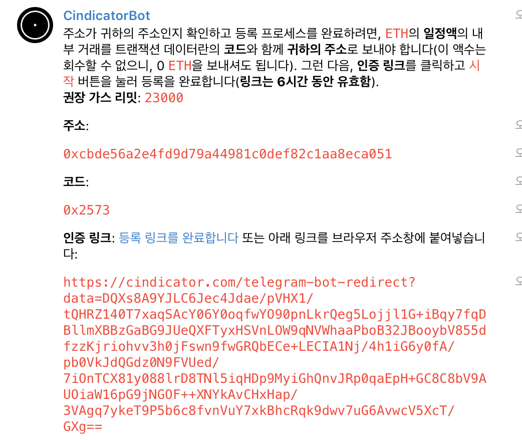 아래와 같은 메시지가 나오면 신디케이터에서 메타마스크 개인지갑에 홀딩하고 있는 CND 개수를 확인할 수 있도록 트랜잭션 생성하여 트랜잭션 ID를 신디케이터봇에 알려줘야 합니다. 이를 위해서 메타마스크 자기지갑 주소에서 같은 자기지갑 주소로 0 ETH를 송금하는 것이 필요하며, 이때 Hex Data에 아래 메시지(신디케이터봇이 알려준)에서 제공한 "코드" 값을 넣어서 송금해야 합니다.