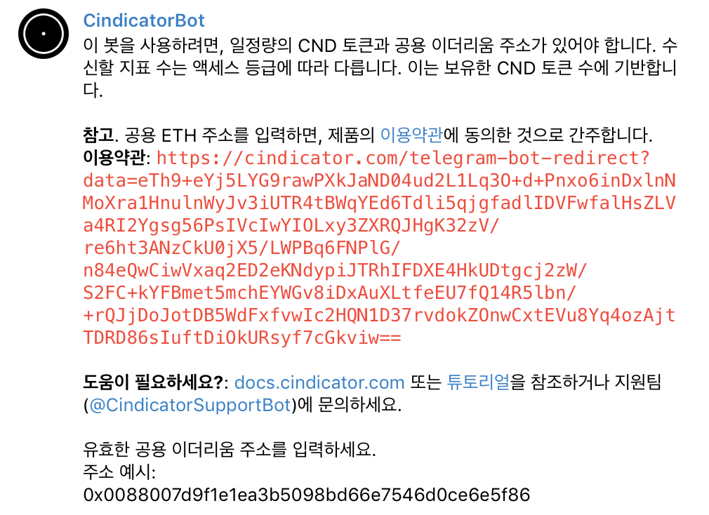 따라서 신디케이터는 메타마스크와 같은 개인지갑에 홀딩하고 있는 CND 토큰 개수를 확인 후 텔레그램을 통해 예측서비스를 제공합니다. 메타마스크 외에도 개인지갑을 활용하여 텔레그램의 신디케이터봇을 설정하여 서비스를 받을 수 있으나 본 글에서는 메타마스크로 설정하는 방법만을 설명합니다.