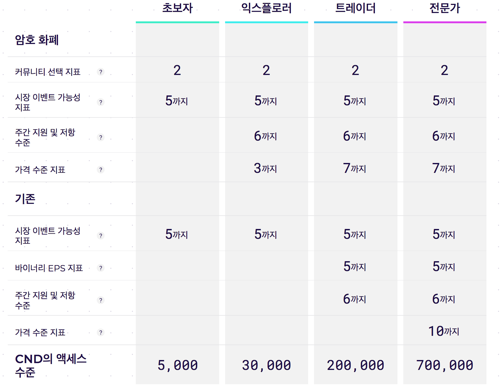 신디케이터에서 제공하는 암호자산과 주식, 금, 원유 등 전통적인 자산에 대한 예측 서비스는 텔레그램(Telegram) 메신저를 기반으로 제공하고 있으며, 아래와 같이 신디케이터(CND) 토큰을 홀딩하고 있는 양을 기준으로 차별화된 서비스를 제공합니다.