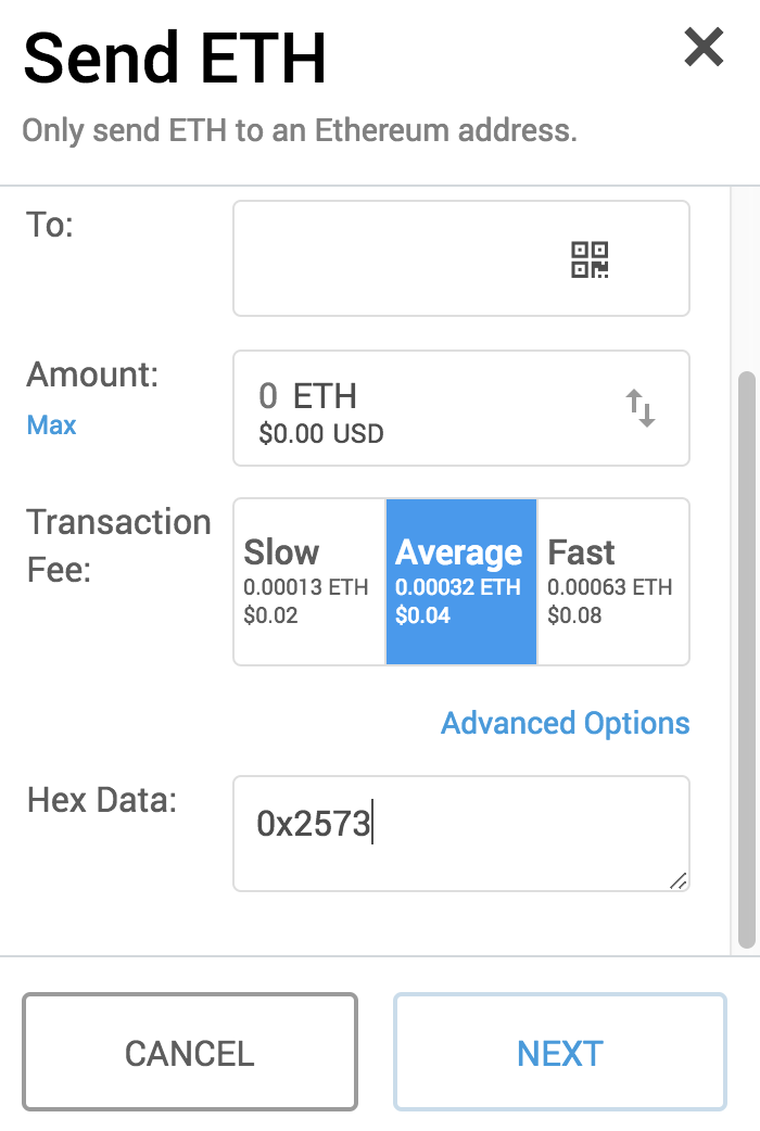 아래 화면에서 "To" 입력 박스에 지갑 주소를 복사하여 넣고, "HEX Data" 입력 박스에 신디케이터봇이 알려준 코드를 넣습니다. 16진수라 "0x"로 시작하는 값입니다. (주의사항) 아래 이미지의 코드 값을 넣으시면 안됩니다. 텔레그램의 신디케이터봇이 알려준 코드를 넣어야 합니다. 은행 송금시 OTP(One Time Password)와 같이 개인별로 다른 코드 값이 생성됩니다. 입력을 다하셨으면 "NEXT" 버튼을 클릭합니다.