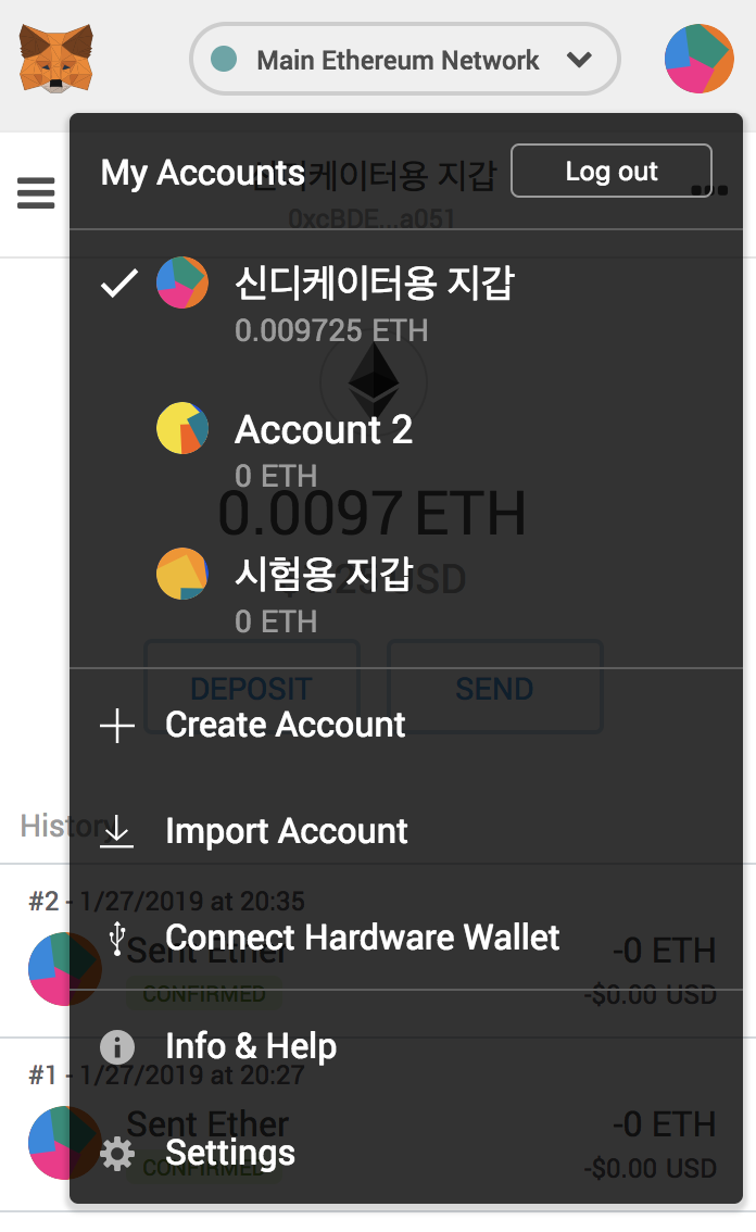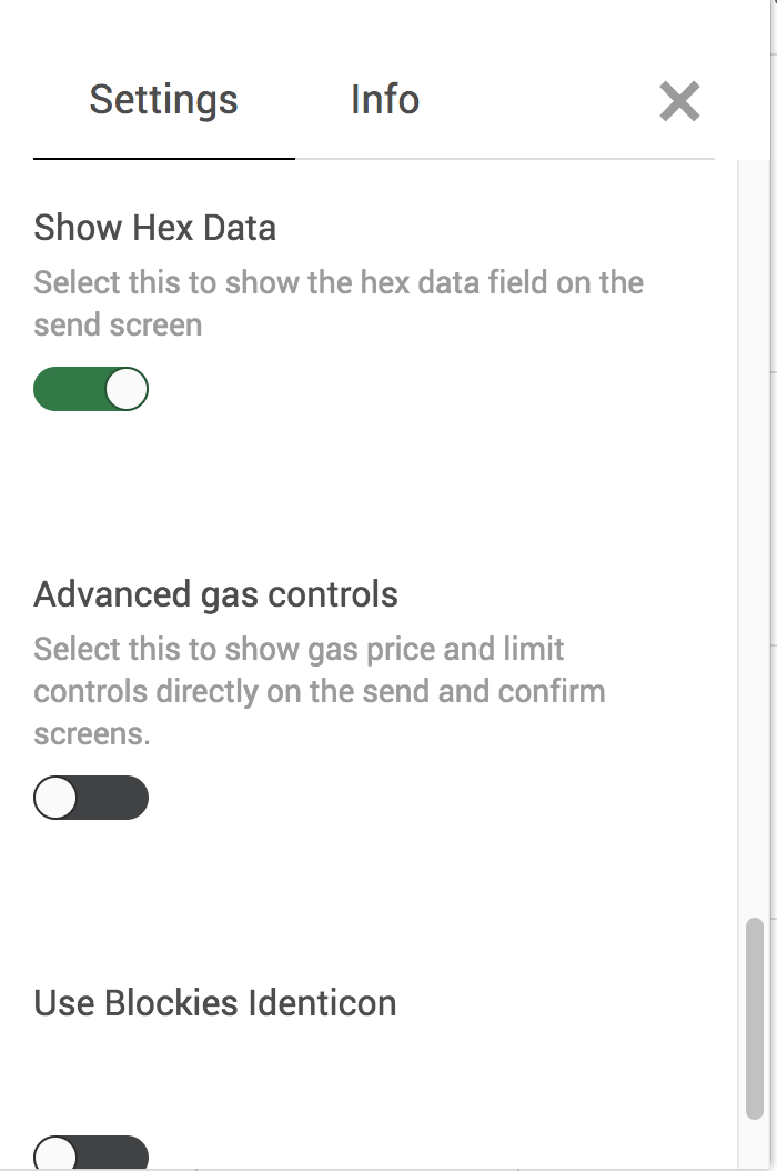 자 그럼 트랜잭션 생성을 위해 메타마스크 개인지갑으로 가서 0 ETH를 송금해 봅시다. 이를 위해서 먼저 메타마스크 설정에서 "HEX Data"를 입력이 가능하도록 설정변경이 필요합니다. 기본적으로 "HEX Data"는 disable 되어있어 설정을 변경하기 않으면 입력 박스가 보이지 않습니다.