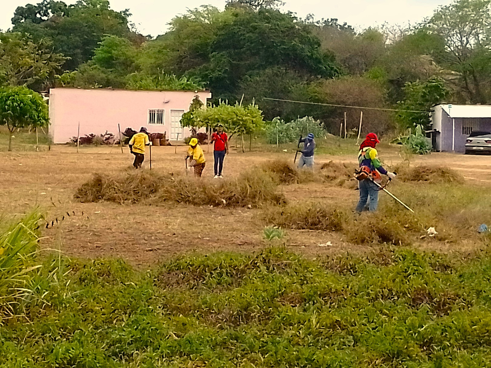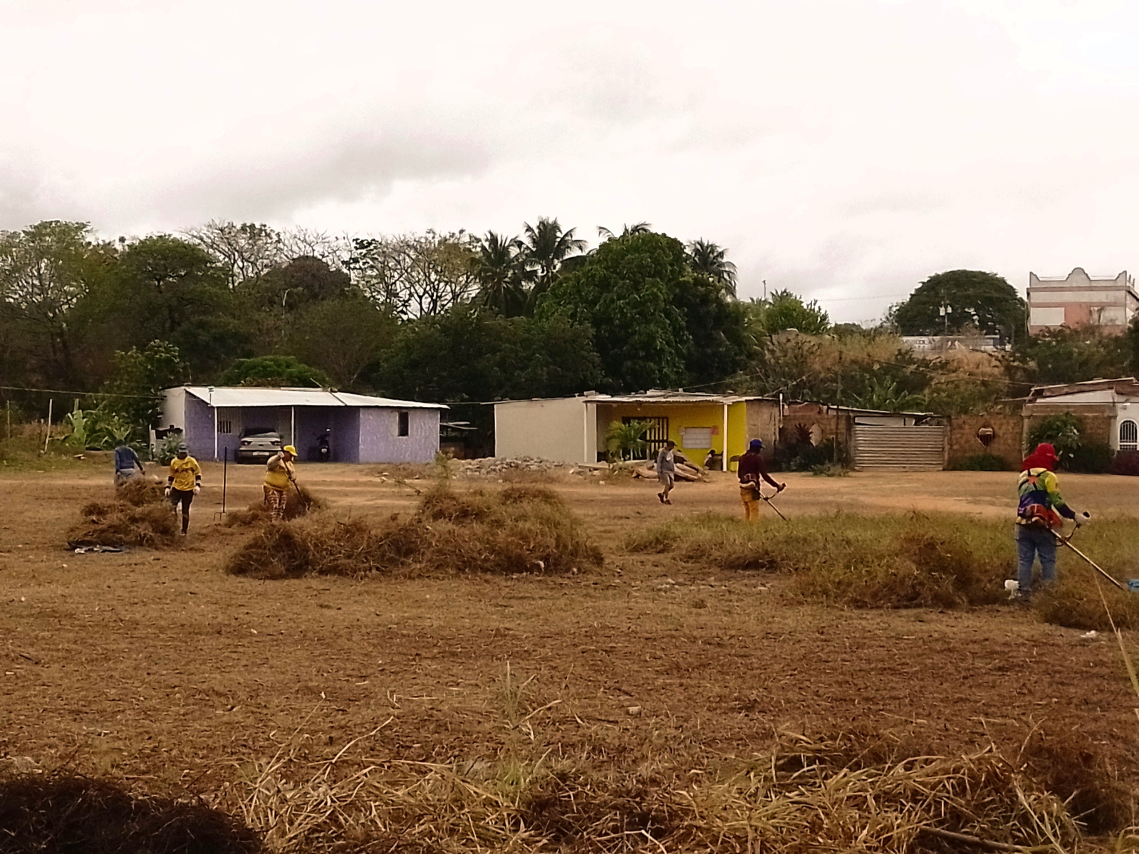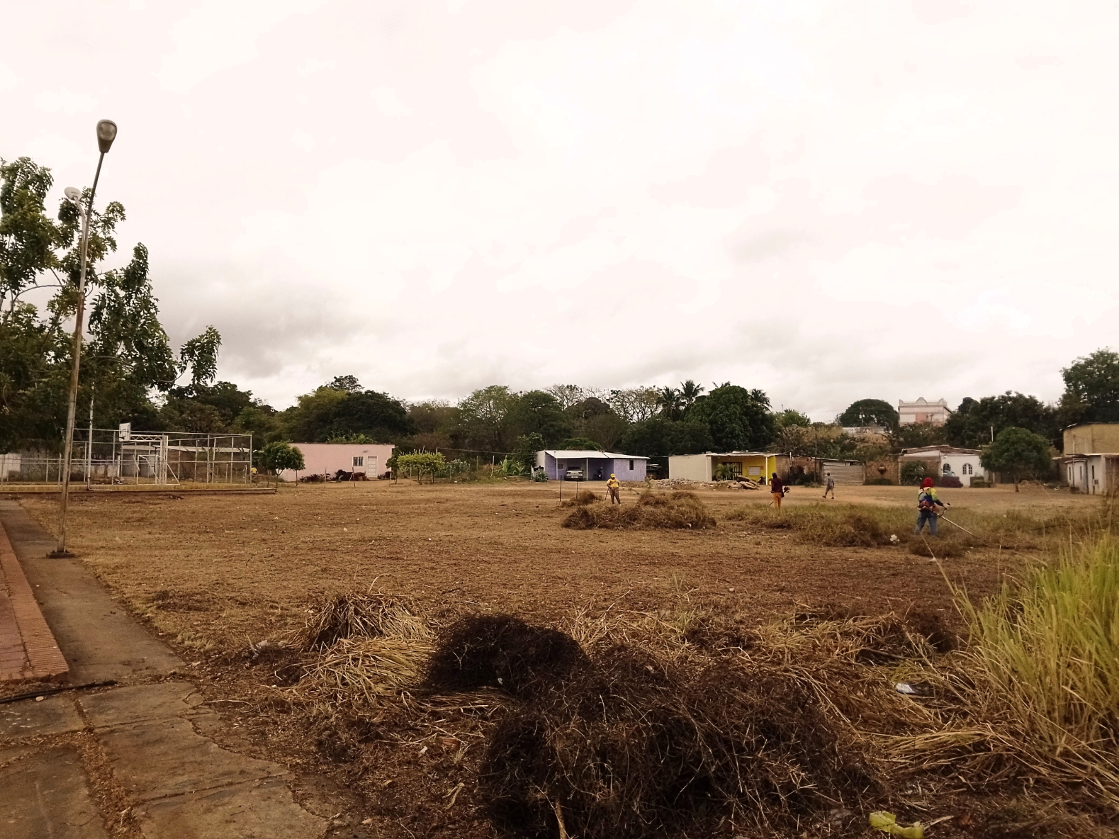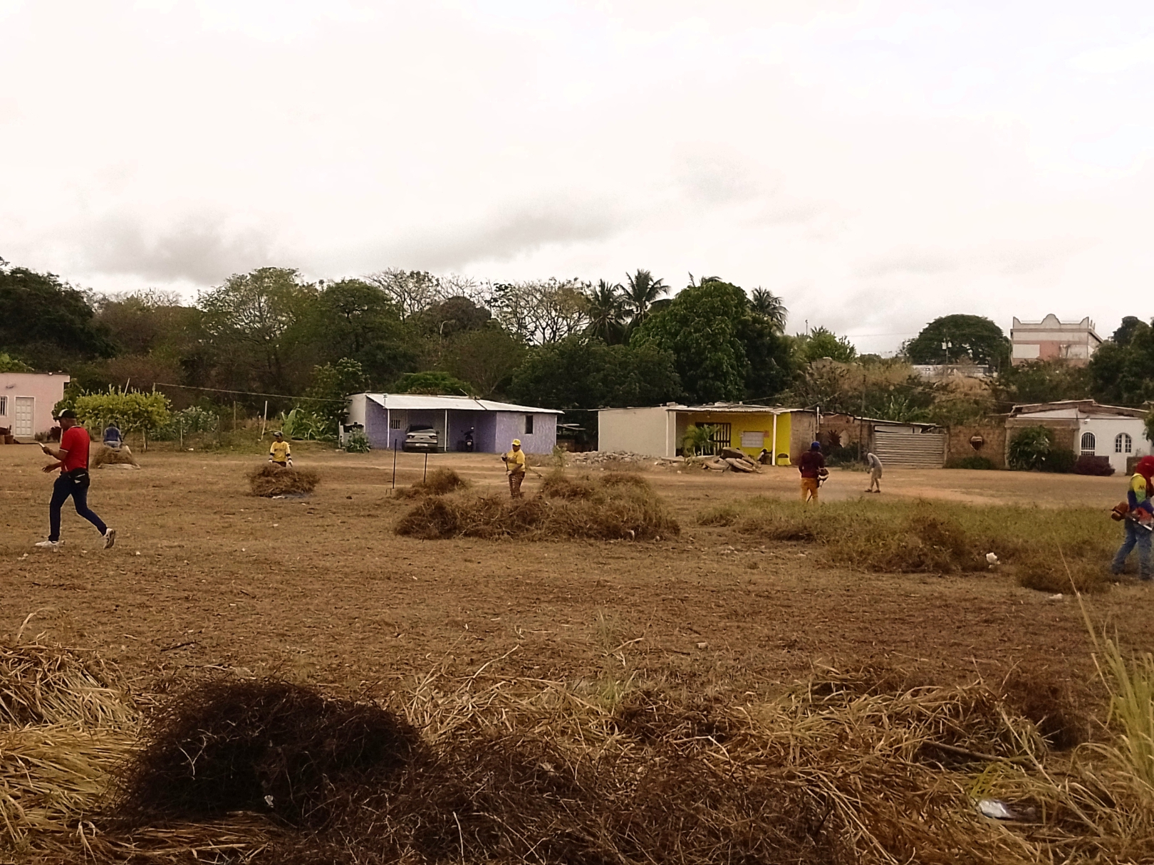El terreno baldío que a veces se convierte en un campo de beisbol tiende a cubrirse de maleza una vez que comienza la época de lluvias (entre marzo y abril), y ya desde ahí en adelante se hace difícil caminar por allí, salvo por algunos senderos que se mantienen por el constante pisoteo de las personas que viven cerca. Pero, de vez en cuando, las autoridades competentes se acuerdan de que este barrio existe y, como ocurre en lo que se ve en estas fotos y en el video, han enviado al sector a un grupo de contratistas, jardineros de oficio, con el fin de que se encarguen de cortar el monte, el que por cierto consiste en una serie de malas hierbas no tan fáciles de remover.