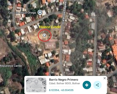 El escenario escogido para la presente publicación forma parte de las áreas verdes de un sector conocido con el nombre de Hueco Lindo, este vecindario se localiza en el oeste de la avenida San Vicente de Paúl, en Ciudad Bolívar (Venezuela). Se trata de un terreno baldío utilizado parcialmente como un campo de beisbol por parte de los jóvenes del barrio. Se estima que abarca un área de algunos 3,000 metros cuadrados. A la vez, dicho espacio se localiza al lado de la cancha deportiva situada al borde de la calle Los Teques.