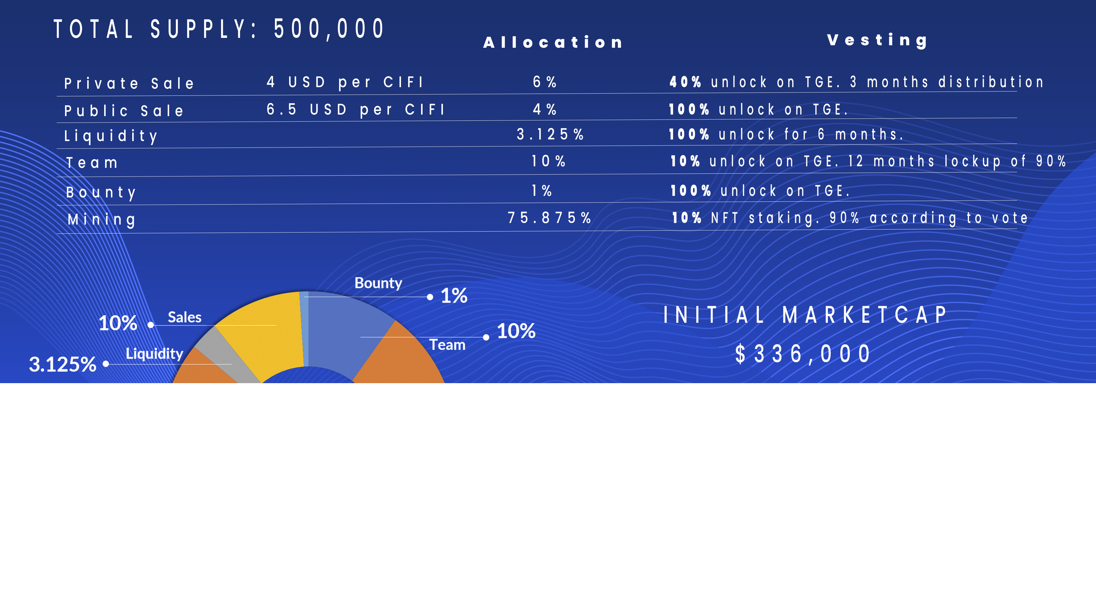 Ciphi is the native token of Citizen Finance platform, the token is minted through NFT staking and Liquidity mining. Users can utilize Ciphi token to purchase nfts from the secondary marketplace, use as fees to launch own skin proposal, deployment fee for Cifipowa , stake Ciphi to earn liquidity reward and also use for lending protocol.