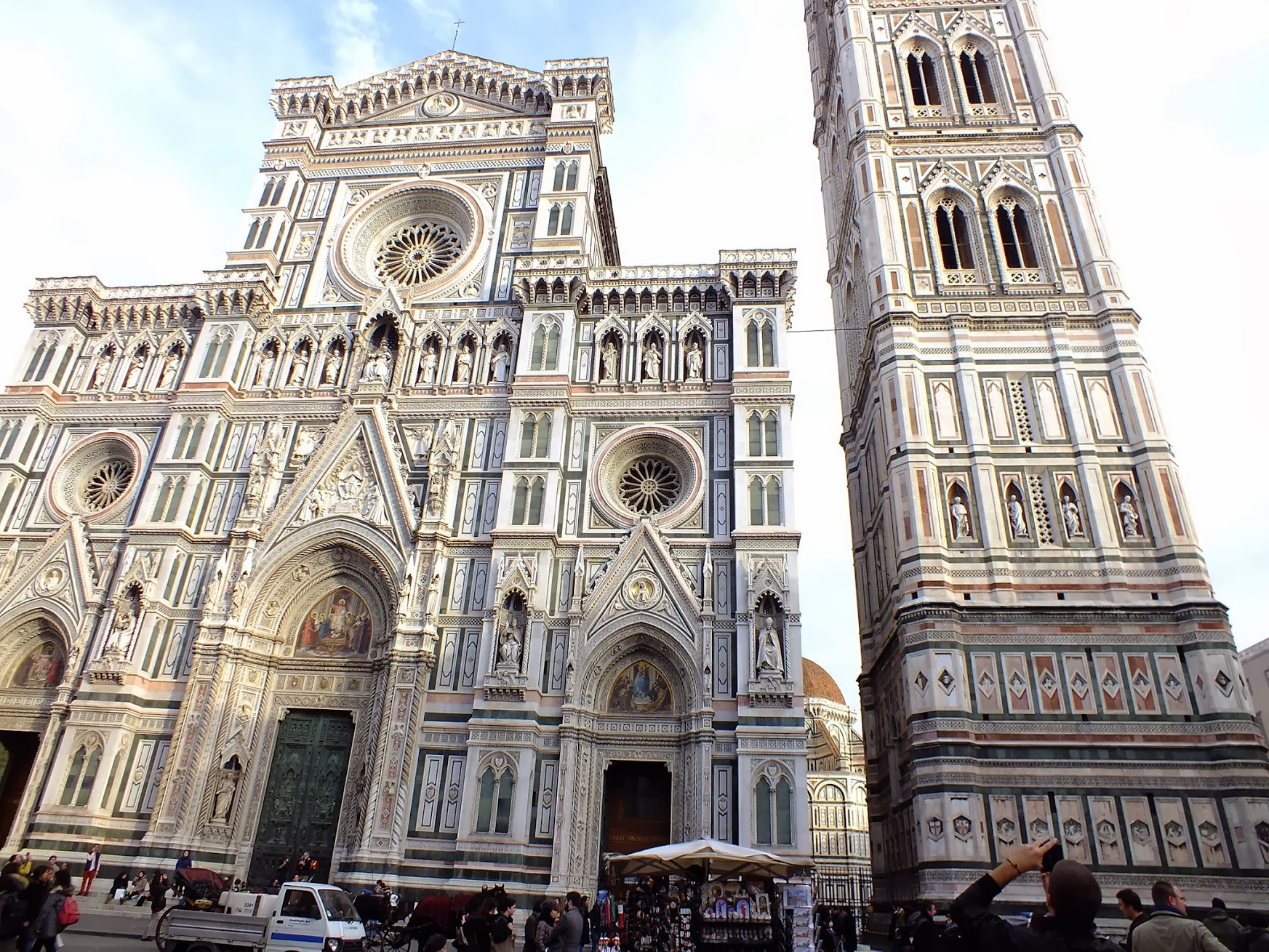 Campanile is 85 m tall . It is clad in white, green and pink Tuscan marble. Brunelleschi’s revolutionary achievement was to build the largest dome of its time without scaffolding.