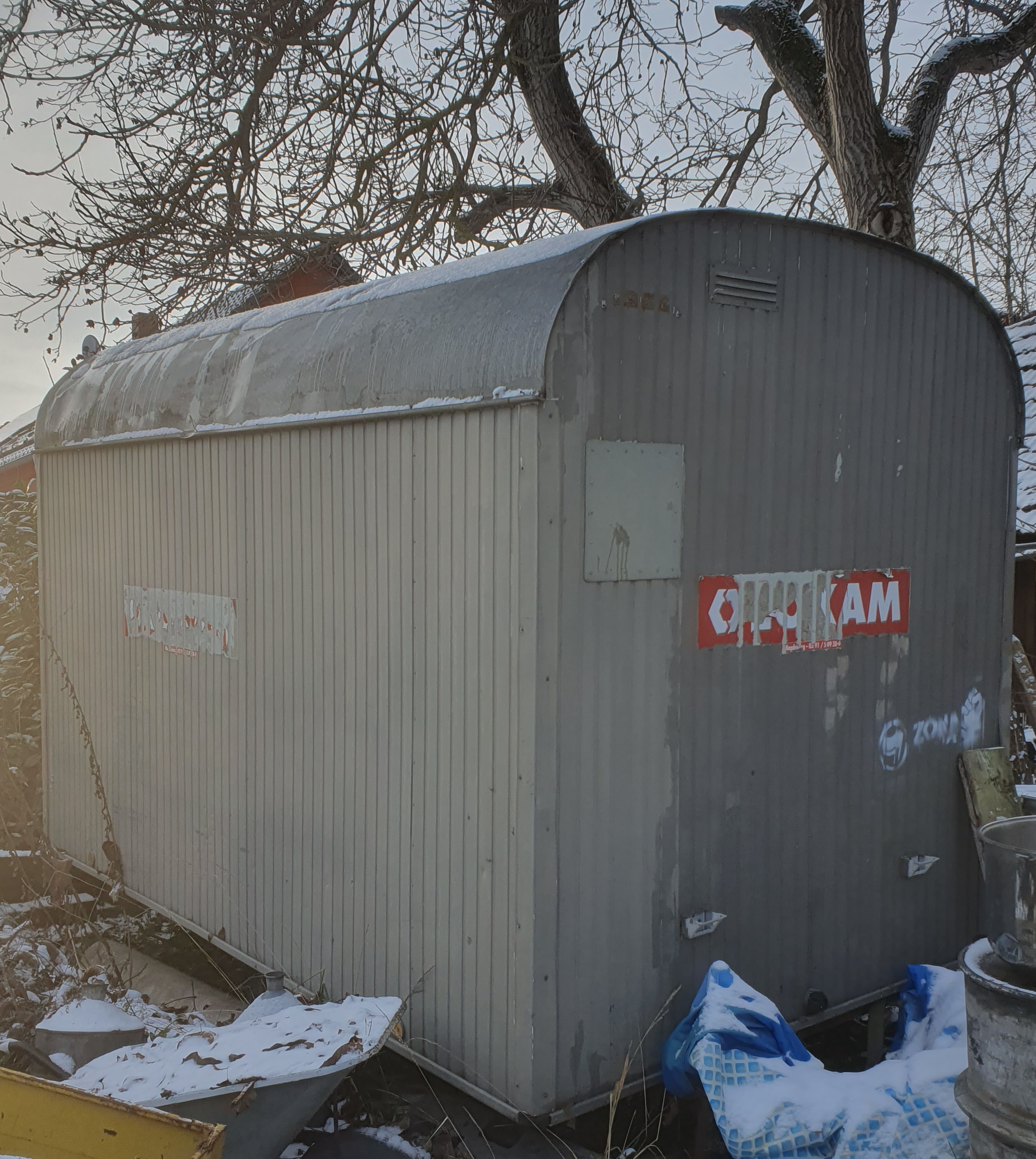 Der Stall ist zum Glück ein stabiles Backsteingebäude. Das Wohnhaus bedarf auch noch viel Zuwendung. Derzeit schlafe ich in einen komfortablen Wohncontainer.