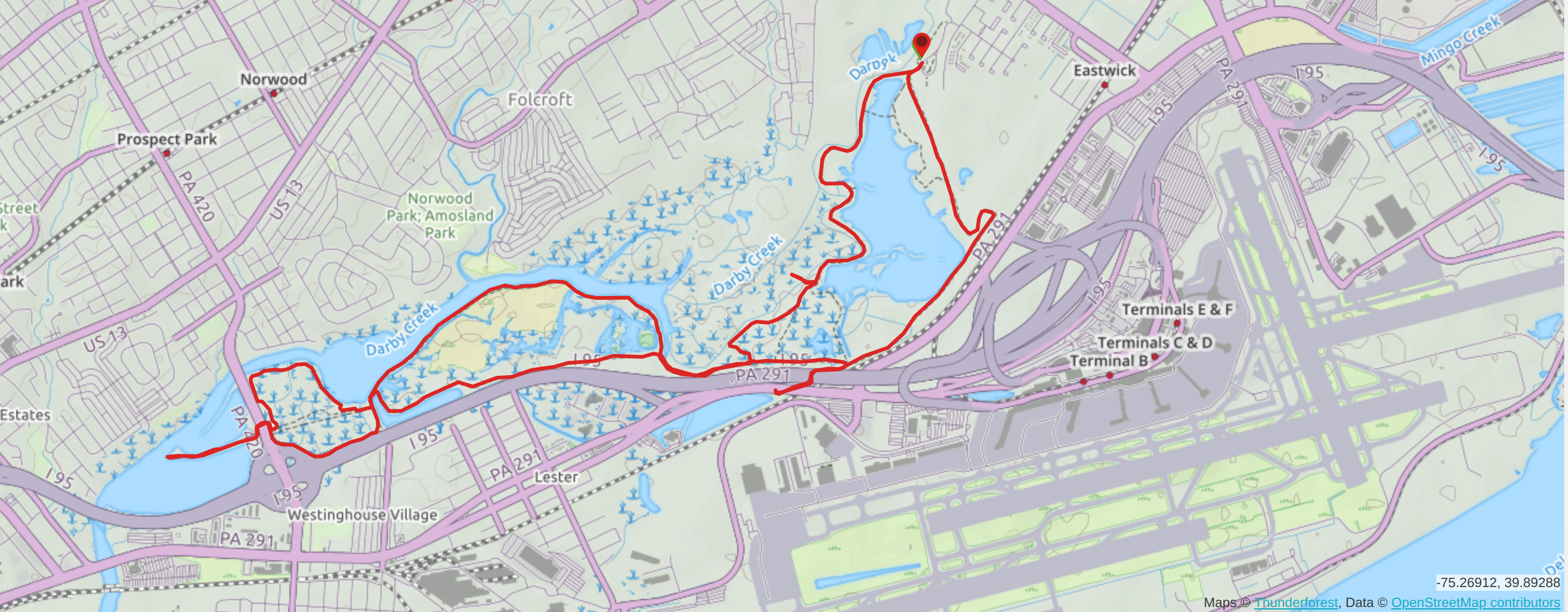 Notice the close proximity to the highway and PHL airport. It is amazing how vibrant the wildlife is and how extreme the juxtaposition of nature to manmade. There is even a side trail that let's you run under the highway I-95: