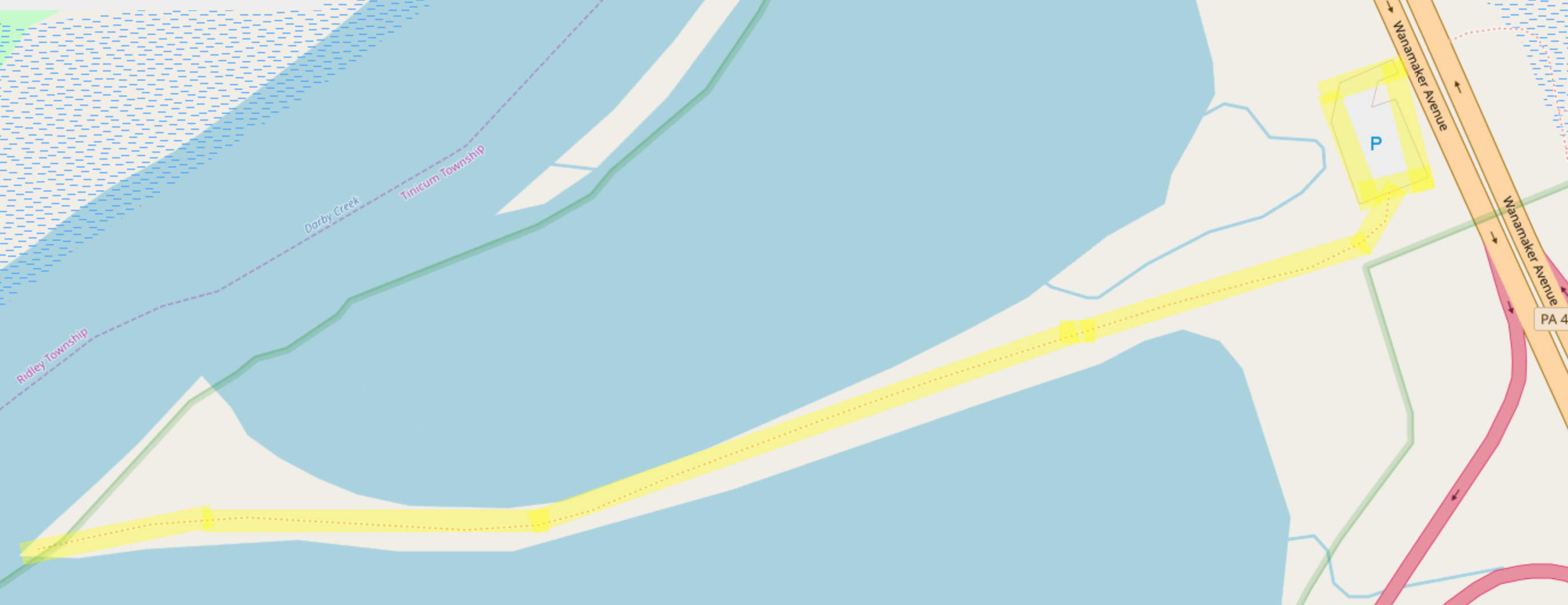 The trash bags were located at GPS coordinates 39°52'19.4"N 75°18'28.8"W, which sits on a peninsula (man-made petroleum pipeline). You can see the peninsula and trail in the following photo: