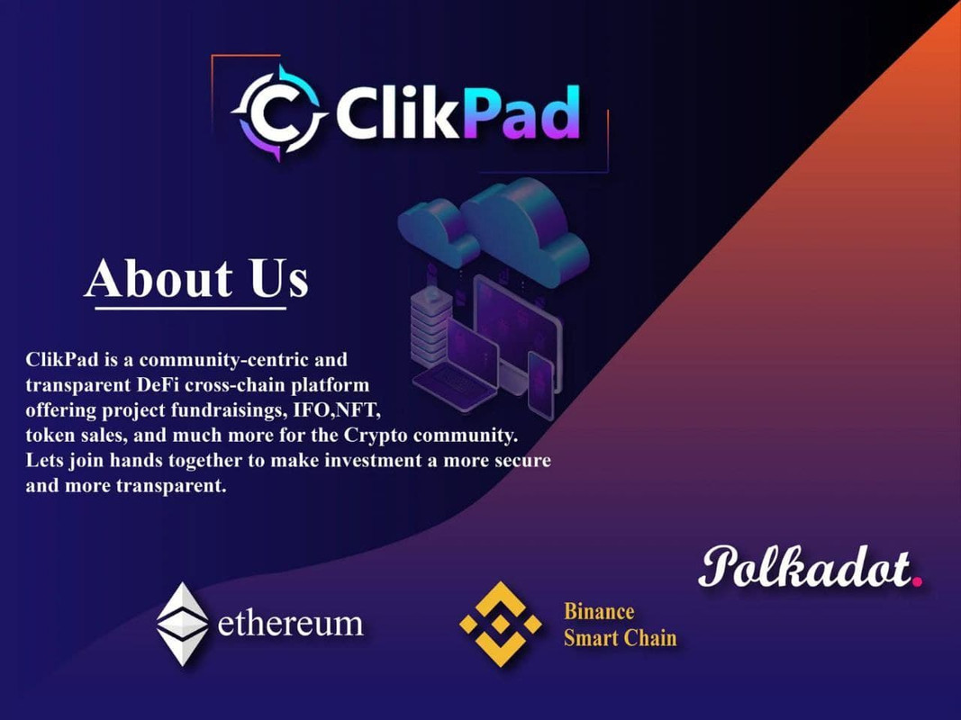 The main goal of the Clikpad project is to eliminate the single-chain capital raising cap for ambitious Multi-Chain projects.Cross-chain DeFi platform that offers project fundraising, IFO, NFT, token sale and much more for the Crypto community.
