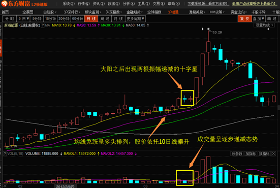 均线系统通常以完美的多头排列列示,股价沿着10日均线强劲攀升,在股价的持续拉升过程中,出现两根并排上扬的阴线或阳线十字星,且成交量逐步递减,这是拉升途中的洗盘换手,是股价加速上涨的信号,投资者不必惊慌,股价仍将持续原来的升势上扬。
