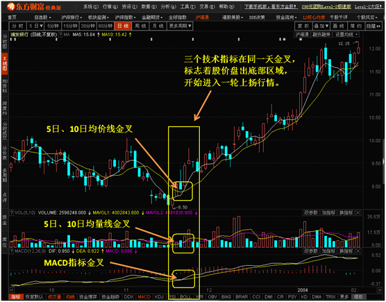 3. 当成交量继续放大推动股价上行时,5日、10日均价线、均量线和MACD自然发生黄金交叉。