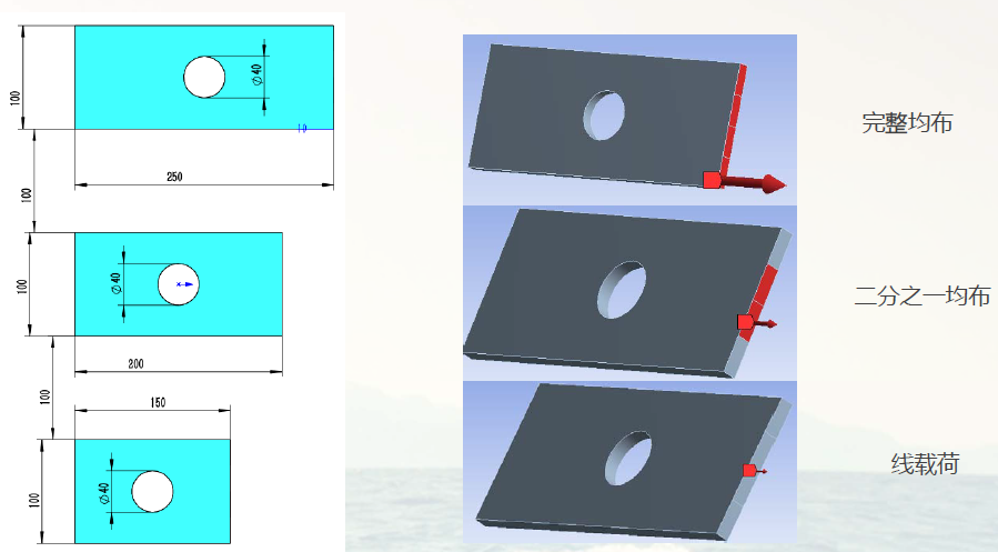 在workbench中对以下三种不同尺寸的带孔矩形板进行仿真,边界条件和施加力的大小、方向相同,施加载荷的方式为:完全均布载荷、部分均布载荷、集中载荷。