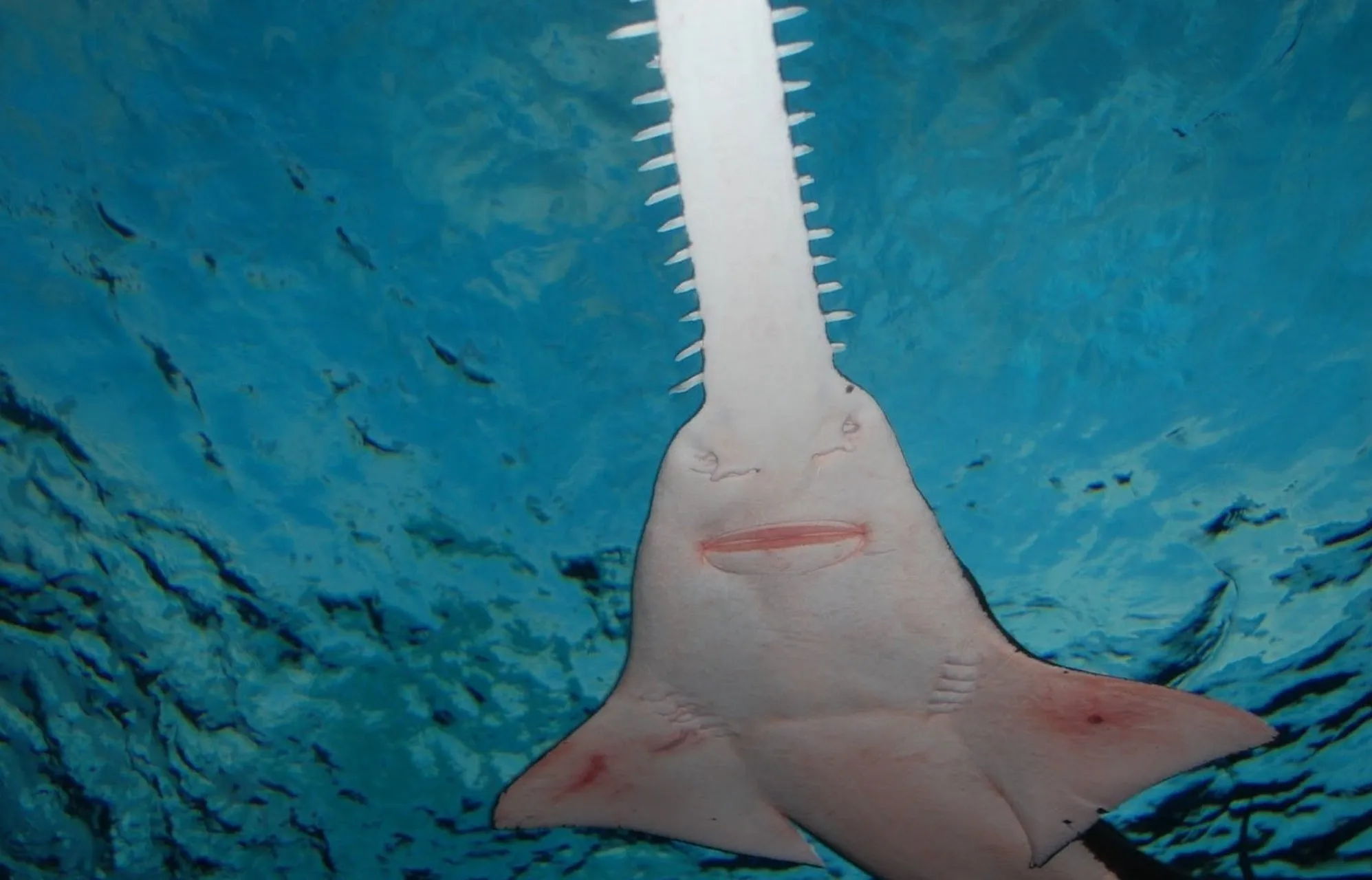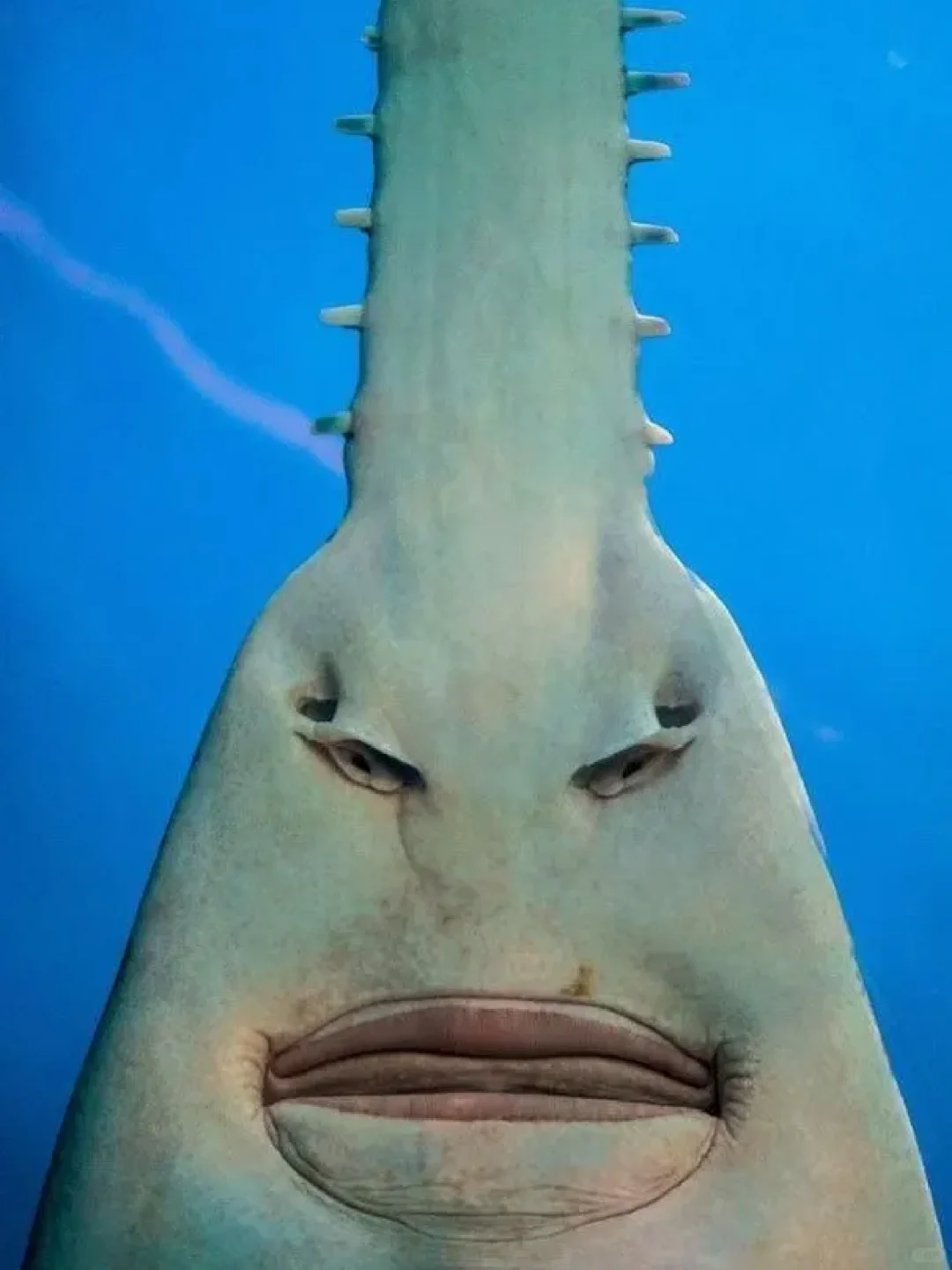 锯鳐这生物,简直是海洋里的“抽象派大师”。你看它那正脸,有“眼睛”有“嘴巴”,还有两撮“粗眉毛”,活脱脱一张人脸,不过仔细一瞧,“眼睛”其实是鼻孔,这长相,就像是上帝创作时不小心手抖了一下。
