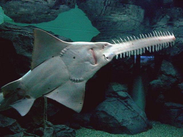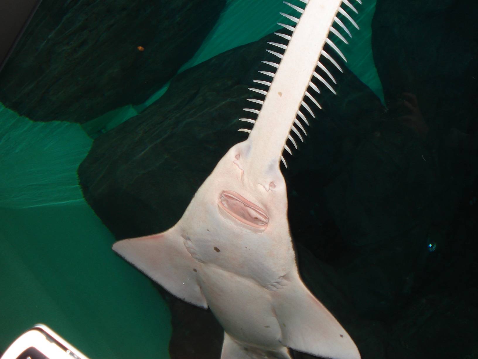锯鳐最显著的特征是头部前方延伸出的“锯状吻部”,长度可达体长的1/3,吻部两侧均匀分布着锋利的锯齿,整体形态兼具攻击性与辨识度。其身体呈流线型,体表覆盖细密鳞片,尾部粗壮,既能在水中灵活游动,又能借助吻部完成捕食、防御等核心行为。