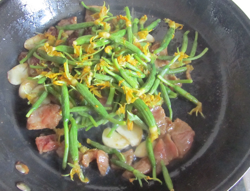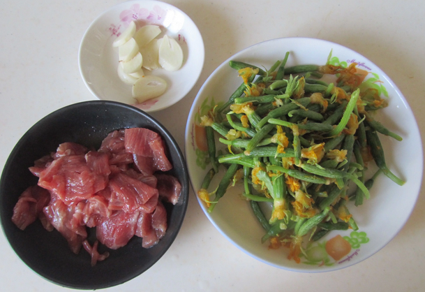 【黃瓜花炒牛肉】 原料:牛肉1小碗黃瓜花1盤蒜3瓣蛋清半個澱粉1小碗料酒1勺生抽1勺油鹽適量 製作:1.準備好原材料;