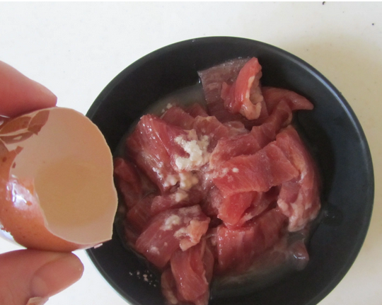 4.加入半個蛋清,拌均勻腌制一下;(重點喲,腌制牛肉時放入蛋清讓牛肉更滑嫩)