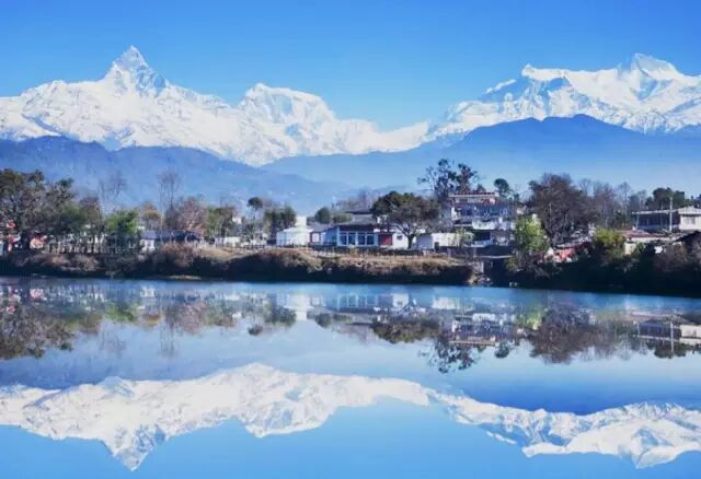 观赏雪山倒影最好划船到费瓦湖南岸。当湖面平静之际,湖光山色极为醉人,特别是雪山在湖面上的倒影又会勾起游人的多少遐想。