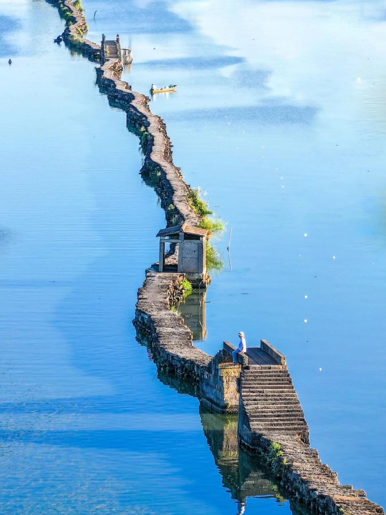 ➌昂桑湖:蓝色的湖面上,一条纤细的古道,走在上面吹吹风很惬意