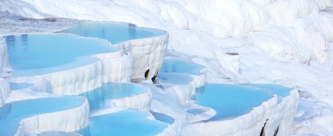 在土耳其东部,这个城市被称为“棉花堡垒”,有些是由温暖的城市,一个有绿松石梯田的小村庄发起的。游客在池塘和泉水中洗澡数千年。