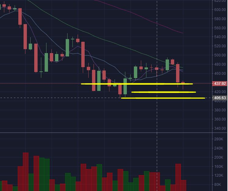 ETH:这个币种走势还算稳定,进去也没有特别的利空利好,基本面变化不大,短线支撑420一线,一旦跌破,将考验前期双底支撑。理论上,这一线附近会有反弹,所以可以用30%的仓位博一下反弹,切不可重仓!