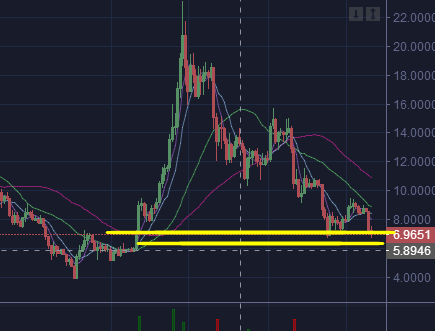 EOS,最近比较惨烈,各种麻烦,各种事儿,技术上7元跌破,创出前期新低(火币价格),下方也无重要支撑,最大的概率会直奔6.5而且,在这一线会有反弹。但整体大势已去,注意控制风险,不要急于抄底。