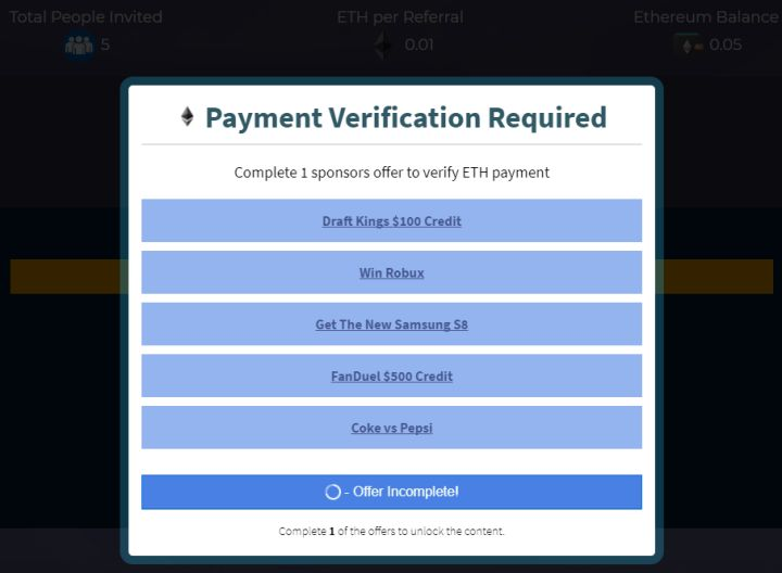 邀请5人注册“免费”发ETH。非常老掉牙的骗局,不过包裹了“区块链”概念后依旧很多人上当。