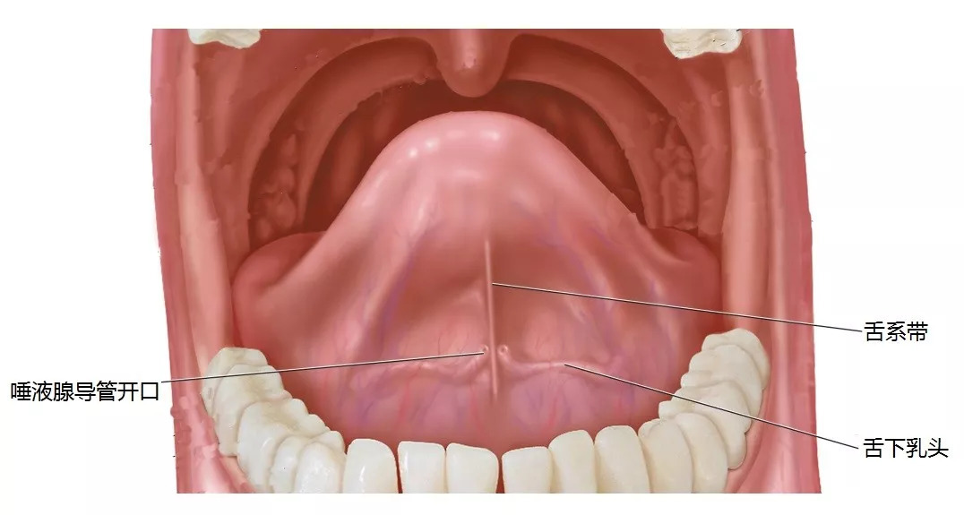 在舌头下面有一个叫做“舌系带”的关键结构,是一层黏膜组织,将舌头牢牢连接在牙龈上。这层黏膜内形成了一个称为“舌下乳头”的褶皱,其中含有唾液腺,“口水”会通过这条管道分泌出来。除此之外,舌系带的另一个重要功能就是调整舌头的位置,以便清晰的“说话”。