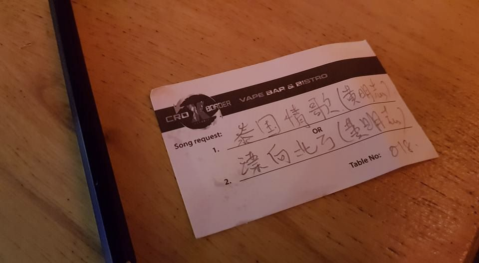 一直以来,我都很喜欢民歌餐厅。喜欢那种听unplugged演唱会的feel,和大家现场的互动。而这件酒吧也拥有驻唱的设备。我们的位子也拥有最好的坐标。高脚座位,正适合两个矮冬瓜。可以眺望台上驻唱之余又不会被音响震伤,可以欣赏音乐之余又不会妨碍交谈。当时还点了两首歌。两首都是黄明志的"泰国情人"和"飘向北方"。这两首歌都不是我喜欢的歌,纯粹点来"为难"驻唱歌手的。我们都觉得这个点唱卡应该会直接被忽略掉。特别是那首泰国情人,是人唱的吗? 呵呵。