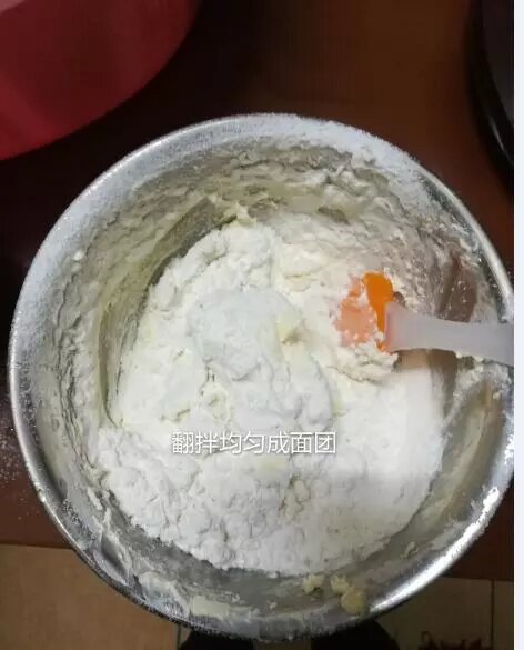 第八步:用橡皮刮刀把面粉和黄油糊拌匀,成为均匀的曲奇面糊