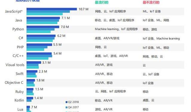 根据报告内容显示,JavaScript 仍然是最流行的编程语言,占据绝对领先的地位。昨天刚满 23 周岁的 JavaScript,目前已经突破了一千万开发者,仅近一年内就有 300 万开发者加入了 JavaScript 社群,超过了 Swift、Ruby 和 Kotlin 的开发者数量之和。1995 年 12 月 4 日,Netscape 公司联合 Sun 公司发布 JavaScript,想必没有人会想到,这个蹭着“Java”热点出生的脚本语言,会凭着天然的 Web 基因走到今天的地位。