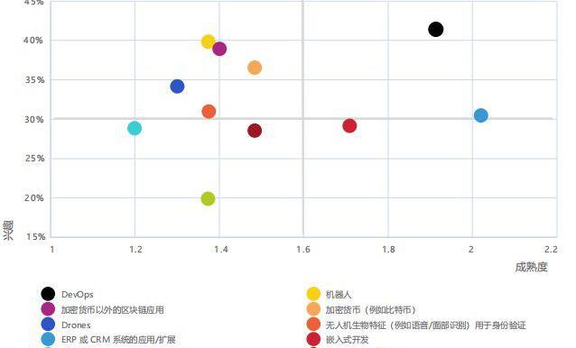 根据图表分析,位于右上象限的 DevOps、ERP 和 CRM 扩展具有高于中位值的兴趣水平和高成熟度,是开发者最感兴趣、也是很多人从事的技术领域。对于位于左上象限的机器人、区块链、加密货币、无人机和生物特征识别技术,开发者们拥有很高的兴趣,但是因为这些技术都还不够成熟,所以实际参与项目的开发者并不多。位于左下象限的 Fog/Edge 计算和量子计算,其兴趣和成熟度都较低。