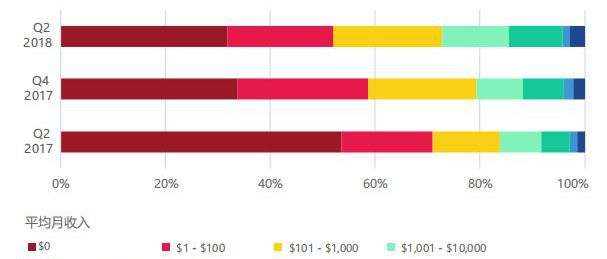 游戏开发热潮兴起。2017 年上半年,只有 29% 的游戏开发者月薪超过 100 美元;而到了 2018 年上半年,这一比例已经跃升到了 48%。