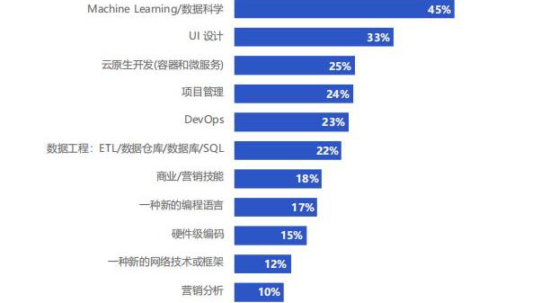 随着人工智能在自动驾驶、计算机视觉、自然语言处理和医学诊断等领域的深度广泛应用,与数据科学有关的技能也自然地成为了开发者最为渴望的技能,45% 的开发者希望学习 Machine Learning 方面的技能,22% 的开发者希望获得数据工程技能,包括 ETL、数据仓库等等。此外,云计算、开源数据科学框架和 MLaaS 平台的出现,再一次推动开发者社群对该领域的兴趣稳步增长。可预见的是,短期内这一技能需求热潮还将继续。