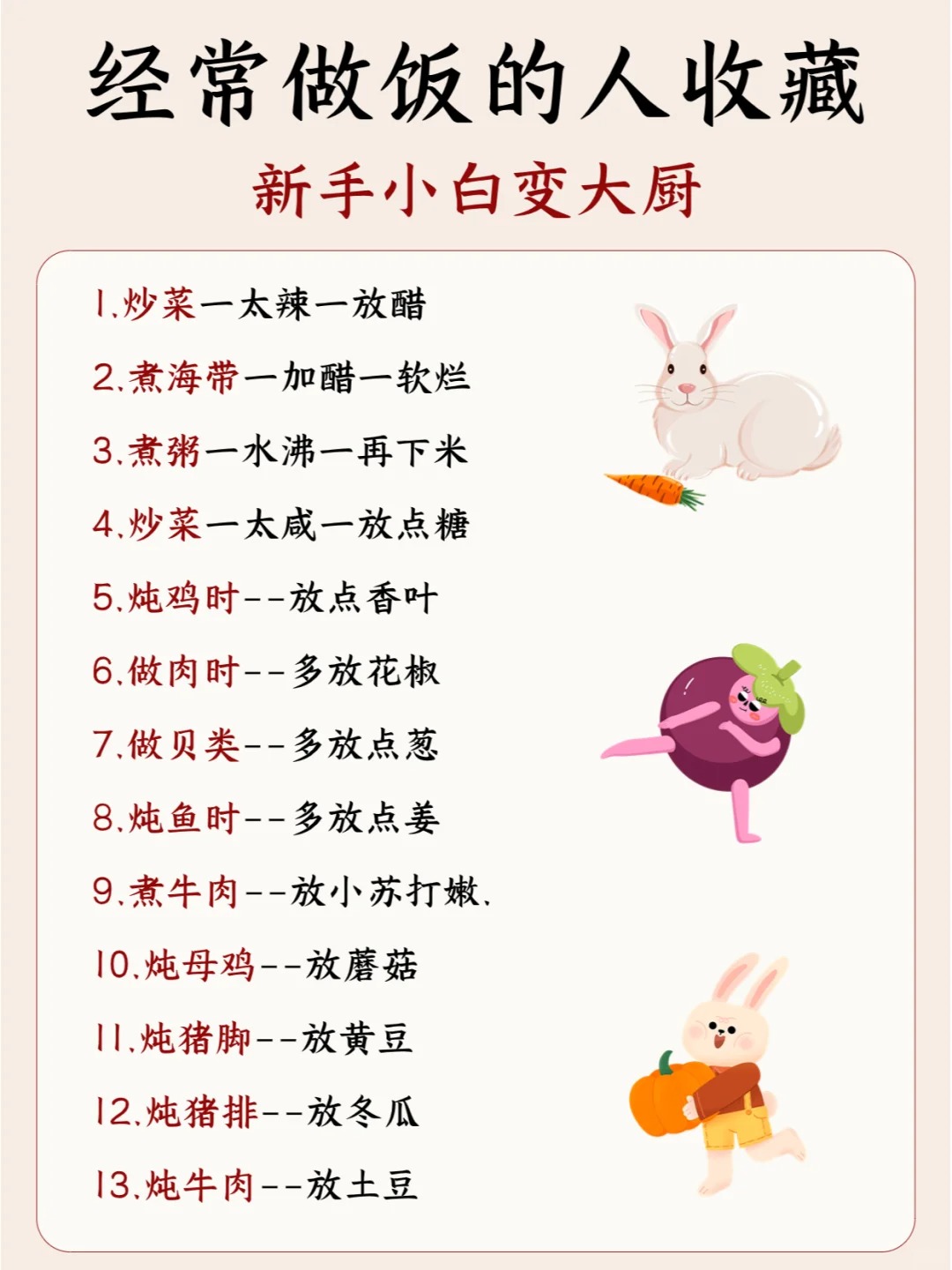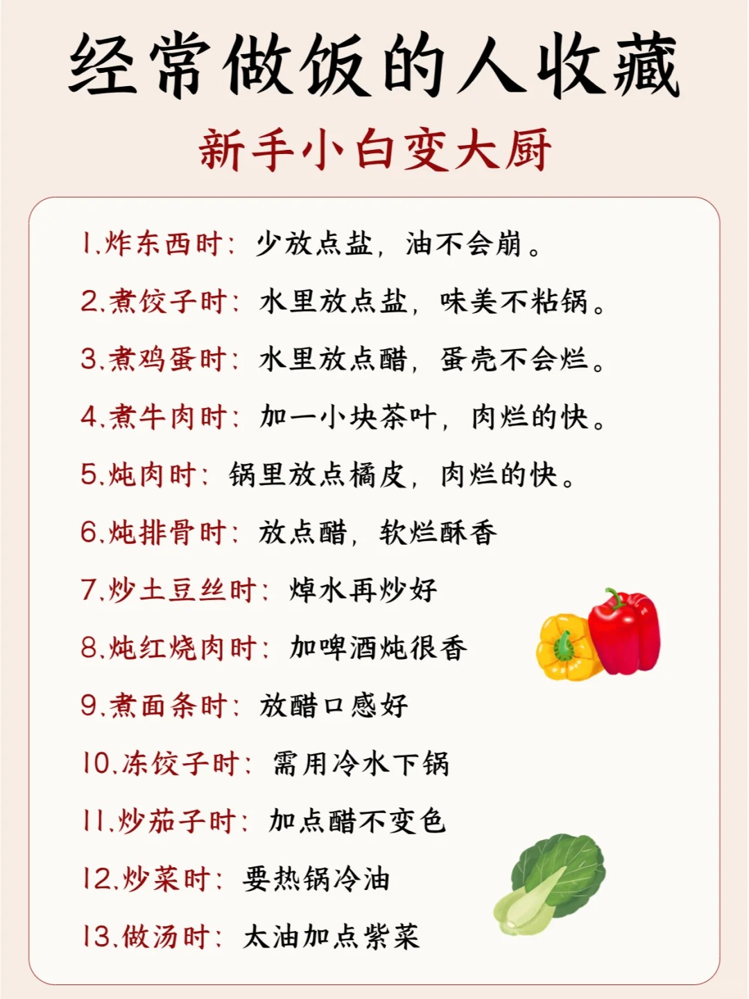 常用做饭小技巧✅码住❗cccaaaooo (26)in #cn • 2 years ago 🥕1.炸东西时:少放点盐,油不会崩。 🥕2.煮饺子时:水里放点盐,味美不粘锅。 🥕3.煮鸡蛋时:水里放点醋,蛋壳不会烂。 🥕4.煮牛肉时:加一小块茶叶,肉烂的快。 🥕5.炖肉时:锅里放点橘皮,肉烂的快。 🍆6.炖排骨时:放点醋,软烂酥香 🍆7.炒土豆丝时:焯水再炒好 🍆8.炖红烧肉时:加啤酒炖很香 🍆9.煮面条时:放醋口感好 🍍10.冻饺子时:需用冷水下锅 🍍11.炒茄子时:加点醋不变色 🍍12.炒菜时:要热锅冷油 🍍13.做汤时:太油加点紫菜 ......