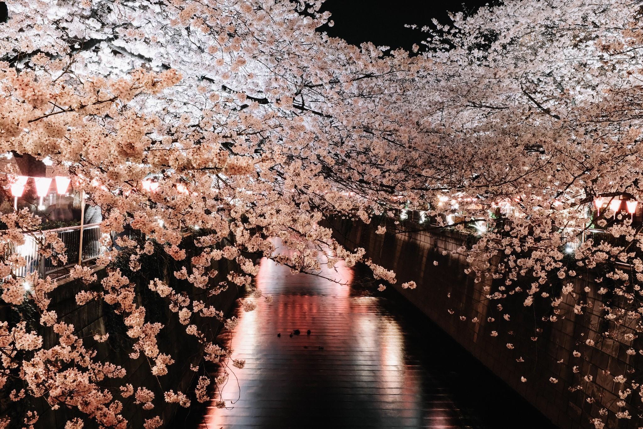 「中目黑」滿開的櫻花,倒映在水面上,整個世界都是粉紅色的