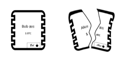 是给Bob新建一张一样的“支票”,证明Bob拥有了1个比特币。同时撕掉Alice手中那张的“支票”,通过这“破旧”并“立新”的方式,实现资产所有权的转移。如图2。