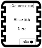 Alice确实拥有1个ZEC。Alice使用私钥对这张支票签名,证明Alice拥有对这笔资产转账的权力。这张“凭证”上多了一串随机数,用符号 r 表示。这串随机数的作用好比 “支票代号”,用来唯一识别该支票。Alice的“支票代号”为r1。