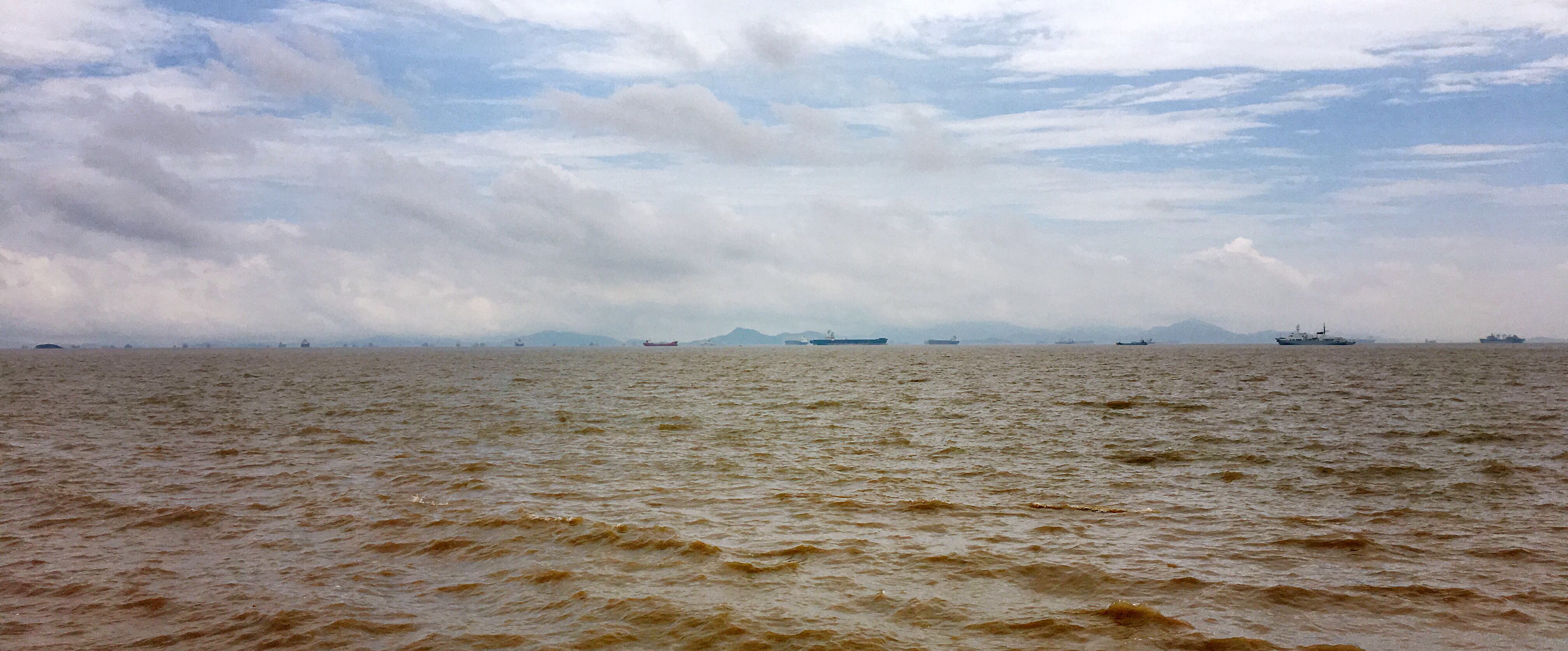 黄浊的海水一下一下地顺风翻腾,一层一层越推越远,直至消失在天边。我的视线也随之向远处扩大飘远,竟怎么也找不见海平线,这就是海天相接吧。真是奇妙。唯一遗憾的是海水的颜色,不蓝却黄。后来得知内海都是这般模样。