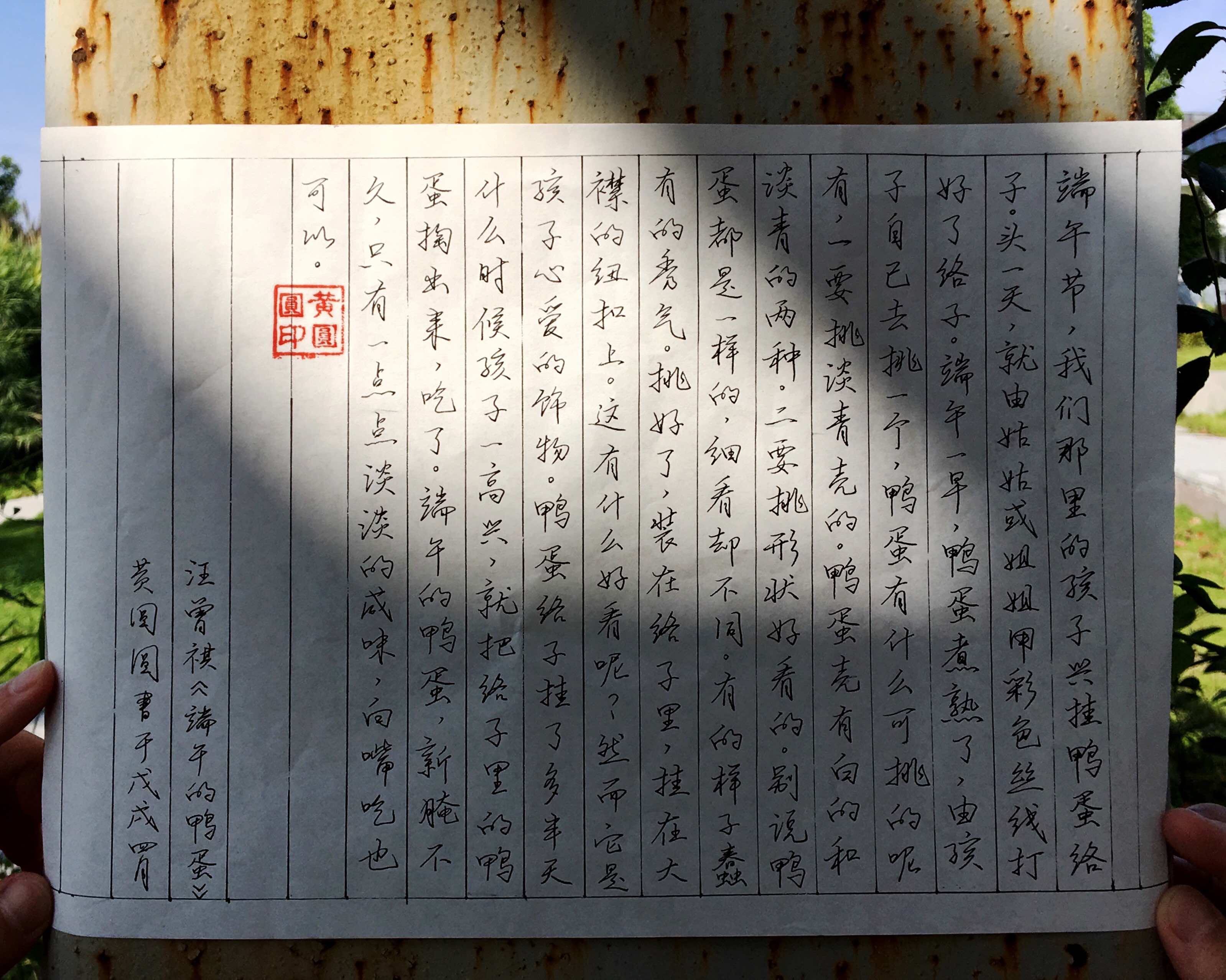 端午节,我们那里的孩子兴挂“鸭蛋络子”。头一天,就由姑姑或姐姐用彩色丝线打好了络子。端午一早,鸭蛋煮熟了,由孩子自己去挑一个,鸭蛋有什么可挑的呢?有!一要挑淡青壳的。鸭蛋壳有白的和淡青的两种。二要挑形状好看的。别说鸭蛋都是一样的,细看却不同。有的样子蠢,有的秀气。挑好了,装在络子里,挂在大襟的纽扣上。这有什么好看呢?然而它是孩子心爱的饰物。鸭蛋络子挂了多半天,什么时候孩子一高兴,就把络子里的鸭蛋掏出来,吃了。端午的鸭蛋,新腌不久,只有一点淡淡的咸味,白嘴吃也可以。