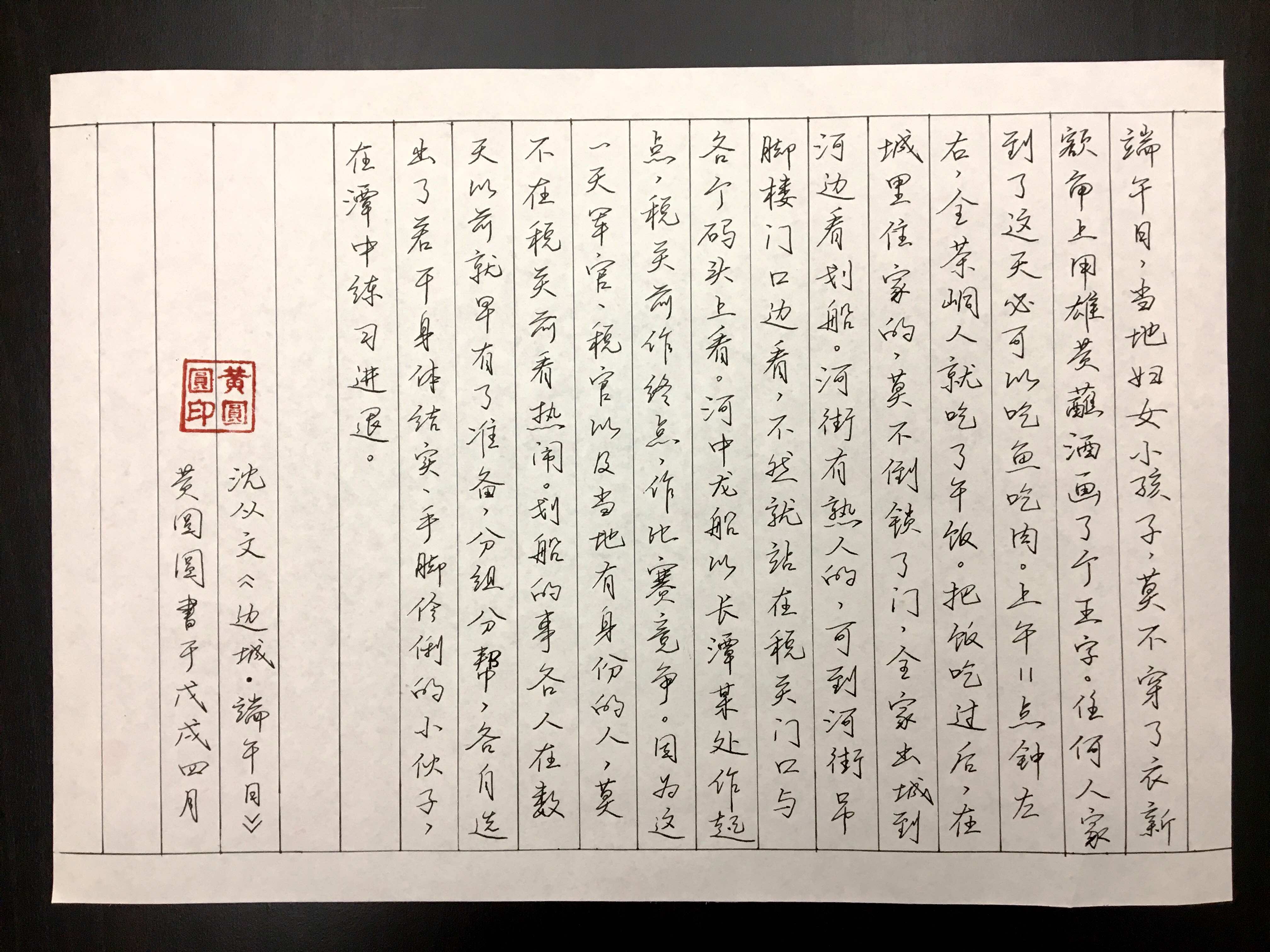 端午日,当地妇女、小孩子,莫不穿了新衣,额角上用雄黄蘸酒画了个王字。任何人家到了这天必可以吃鱼吃肉。上午11点钟左右,全茶峒人就吃了午饭。把饭吃过后,在城里住家的,莫不倒锁了门,全家出城到河边看划船。河街有熟人的,可到河街吊脚楼门口边看,不然就站在税关门口与各个码头上看。河中龙船以长潭某处作起点,税关前作终点,作比赛竞争。因为这一天军官、税官以及当地有身份的人,莫不在税关前看热闹。划船的事各人在数天以前就早有了准备,分组分帮,各自选出了若干身体结实、手脚伶俐的小伙子,在潭中练习进退。