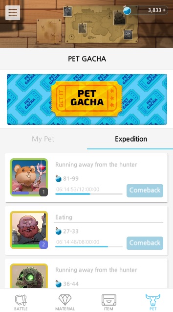 而在最近遊戲的升級中,寵物增加了一項遠征的功能 Expedition,在寵物欄,玩家可以選擇最多4 隻寵物遠征,視乎人物等級,每一次的遠征結束,都會帶有跟寵物等級相對的能量水及材料回來,所以建議大家盡量揀選等級好的寵物去遠征。