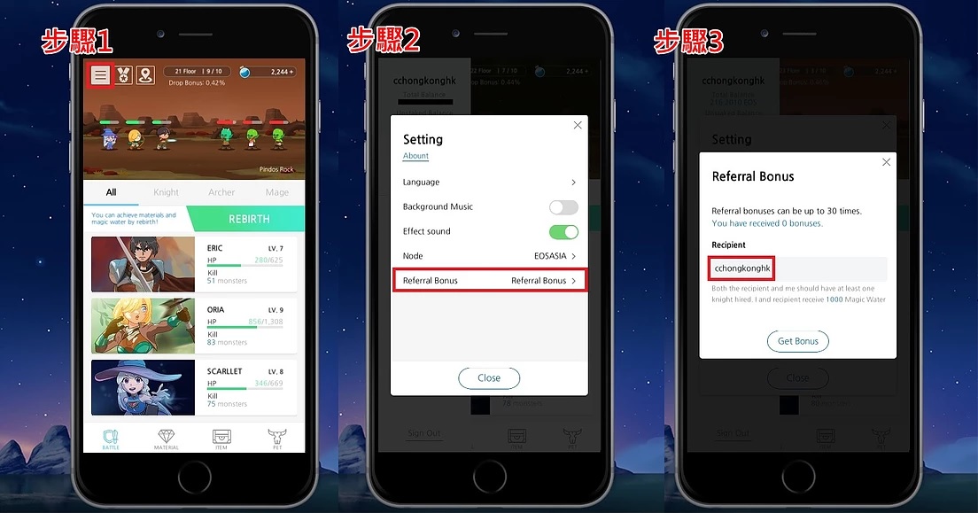 相信,今日的分享,會幫到大家更認識這款充滿趣味的遊戲。有時間小編再編寫一份遊戲攻略篇,讓大家可以更容易從遊戲中賺到 EOS。如果支持小編,而您又想參與 EOS Knights 的話,可以在 Referral Bonus 寫上小編的帳戶名稱,cchongkonghk,這樣您和小編會各自額外多了 1,000魔法水,下一次如果再發掘好玩的區塊鏈遊戲,再介紹給各位,謝謝。