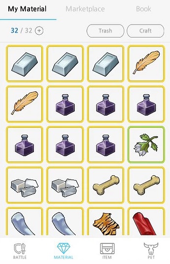 點擊材料 MATERIAL,您所獲得的材料都會在這裡顯示,儲放材料的上限為 28 個,玩家可以升級倉庫,讓儲存材料倉儲放更多的材料。( 第一次升級是0.1 EOS,第二次是0.2 EOS,如此類推。)