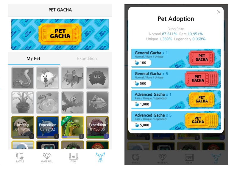 除了合成需要消耗魔法水外,每個角色人物的升級、領養寵物、寵物升級等亦需要消耗魔法水。在寵物方面,每一個人物可配置一隻的寵物,寵物的屬性是可以直接提升人物的屬性,大家只要點擊 PET GACHA ,您便可以領養寵物,寵物是隨機抽出,消耗魔法水 100 及 500 的選擇,可抽出普通 Normal、高級 Rare 及特殊 Unique 的寵物 ; 消耗魔法水 1,000 及 5,000 的選擇,可抽出高級 RARE、特殊 Unique 及傳奇 Legendary。寵物的稀有度傳奇等級 Legendary 是最高級。