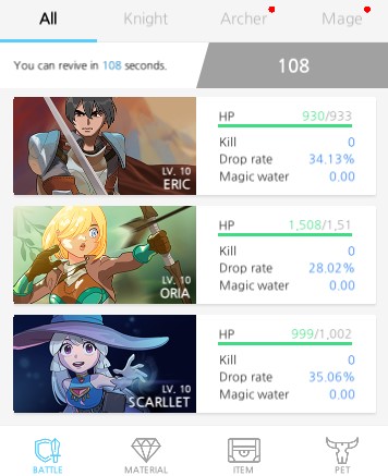 當您購買了人物後,人物便會自動打怪。當三個角色,他們的血量 HP 分別為 0 時,玩家需要點擊復活 REBIRTH 重生,然後所有的角色便會自動重新開始打怪,而同時您將會獲得材料以及魔法水 Magic Water ( 只購買一個人物,只獲得一件、二個人物是二件,三個人物是三件。) 當您的人物等級及裝備愈強,便可因應指定的樓層獲得更稀有的材料及更多的魔法水。小編建議,後期的玩家,因為耗時會比較長,建議可以估算一下需要重生時間,到時才去收材料,然後再幫人物重生。